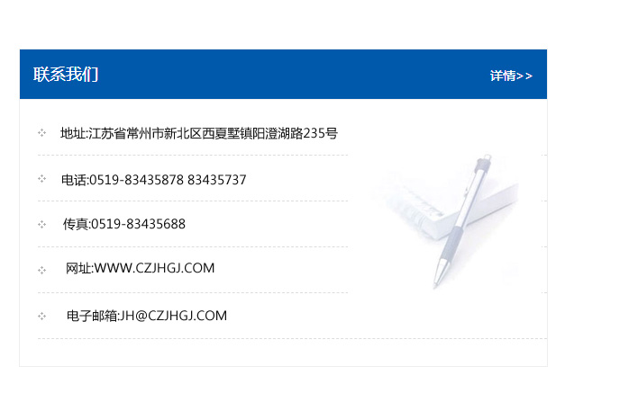 地址:常州市新北區友邦商務大廈1幢16、17層  電話:0519-85101652  傳真:0519-85112595  郵編:213022  網址:www.cz-jiayue_cn.ahdayi.com  郵箱:xiajifengaa@163.com
